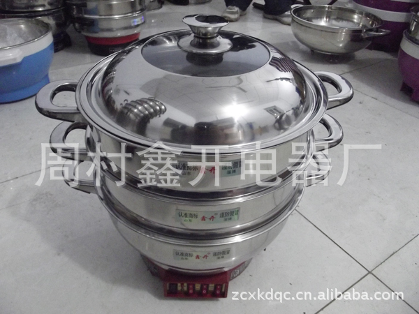 电热锅:一种多功能保健电热锅,通过锅体的合理结构设计,提高锅体的强度、刚度和热效率,改善高温性能,延长使用寿命。电热锅由锅盖、笼屉、锅体、电热元件,温控装置和底座组成,锅体用铸铁压铸而成,外表面敷有彩色搪瓷层,内表面轻吹砂,锅口有不锈钢包边,护罩内装有电热元件,底座上装有温控装置、开关、指示灯等,锅体、护罩和底座用螺栓连接。本实用新型可用来煎、炒、炖、炸、烙各种食物。 本产品采用不锈钢复底工艺,即采用特殊工艺制造的加热盘与不锈钢锅体焊接在一起,使锅具有热负荷大、导热性能好、机械强度高等特点。热效率高达90%以上,本产品,结构合理、功率调节范围大、设有多档功率,可作为制作不同食品的温度选择,使用方便,安全可靠。本产品具有一锅多用的特点。省时省电,可在90分钟内一次蒸馒头19层19公斤总用电量2.75度,每公斤馒头耗电量0·15度。煮水饺效果最佳,可将蒸格蓖子取出坐在锅上,增大空间,盖上玻璃盖,煮水饺不沸锅,熟的快。可做火锅,透过玻璃盖能清楚地看到食物生熟情况,既方便又清洁。