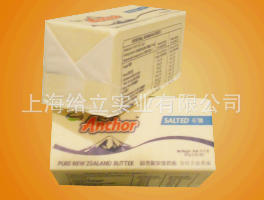 产品说明:黄油是从奶油中进一步分离出来的脂肪,又叫乳脂、白脱油。黄油在常温下呈浅黄色固体,加热熔化后,有明显的乳香味。黄油含脂率较高,短期保存可放入5℃的保鲜冰箱中,长期保存则应放在-10℃的冷冻冰箱中。因其易氧化,故存放的黄油应避免阳光直射,并且还应密封保存。
