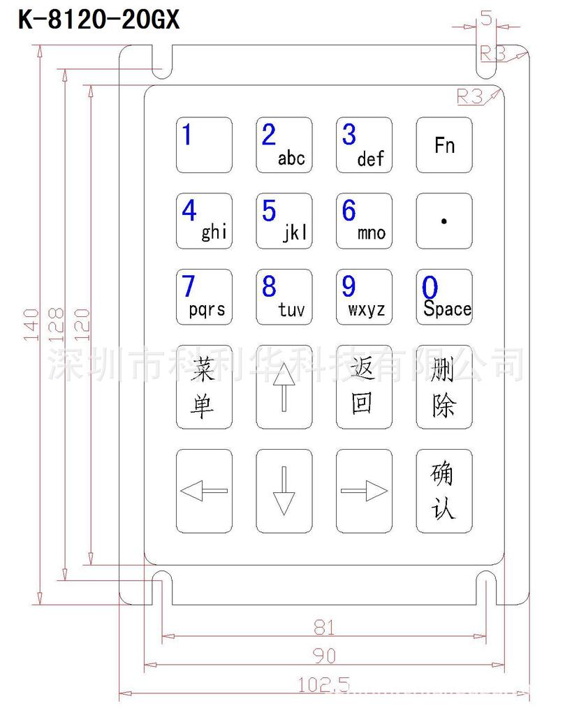 | 型号 | K-8120-20GX | 按键寿命 | 200(万次)按键文字按客户尺寸图要求定制 |