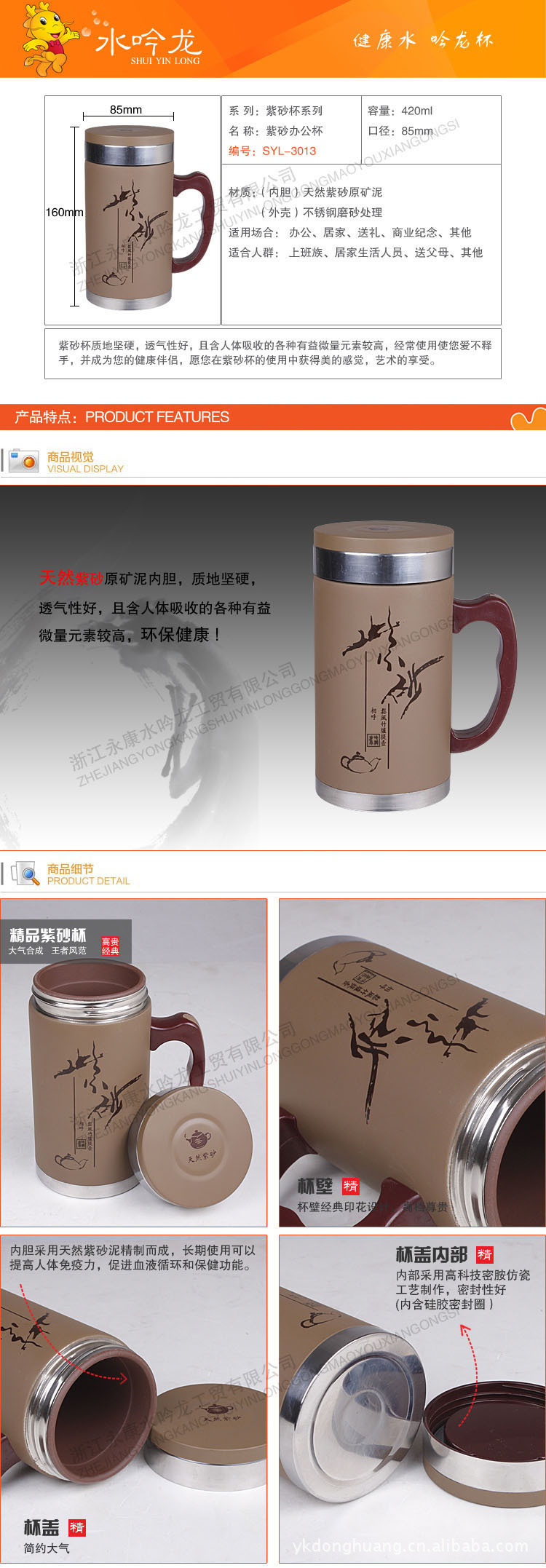 紫砂杯,以江苏宜兴最负盛名。自明朝正德以来的五百年间,中国文人与宜兴历代砂器制作高手合作,将雕刻、镶嵌、书画等多种工艺美术手段用于砂壶(杯),制作出典雅精美的沏茶名壶(杯),为世界各大博物馆所收藏,成为中华一大瑰宝。近年来,紫砂作为居室饰物,不仅具实用功能,且满足了家居的装饰需求,因而受到越来越多人的喜爱。紫砂壶(杯)质地坚硬,透气性好,且含人体吸收的各种有益微量元素较高,经常使用使您爱不释手,并成为您的健康伴侣,愿您在紫砂杯的使用中获得美的感觉,艺术的享受。