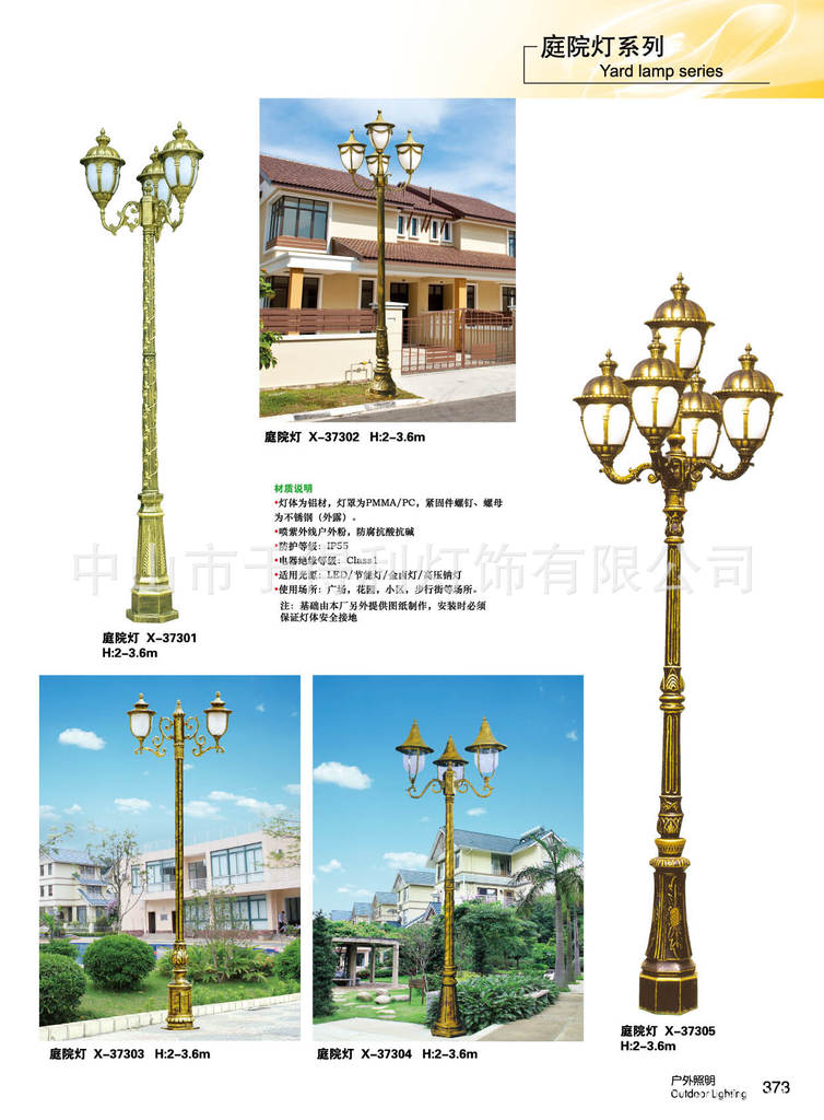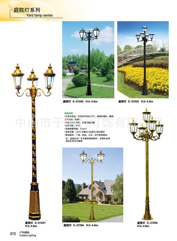 产品名称:庭院灯 详细说明:特点:造型精简大方,为装饰性景观照明灯饰具有很强的夜景装饰效果 适用场所:公共场所、街区、步行道、广场等 光源:LED光源,金卤灯,节能灯 等。 防护等级:灯具防护等级IP65 材料说明:灯柱为铝材,不锈钢,(优质钢材经热镀锌处理后),表面聚肪粉体涂装 灯罩为PMMA 灯罩,玻璃 紧固件螺钉、螺母为不锈钢 特别说明:基础预埋需按本公司要求制作 打开电器箱门需用本公司专用扳手 安装时必须保证灯体安全接地 线体为1.5平方BVVB-300/500双层护套线。
