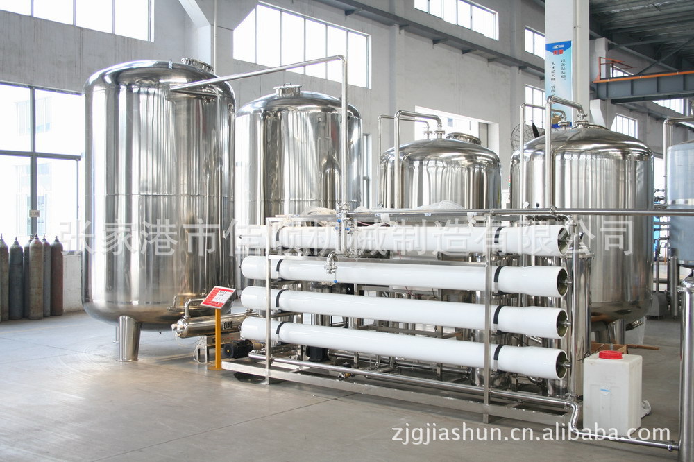 纯净水生产设备由原水预处理部分、反渗透主机和无菌纯水箱及灌装等几部分组成。采用单元组合结构,可减少设备占地面积,便于运输及现场安装调试,具有占地面积小、安装快速、外观漂亮、操作、维修方便等优点,预处理过滤桶体采用不锈钢304材料。设备机架选用不锈钢制作,管道阀门全部304优质不锈钢管材,主要部件(膜、泵阀、仪表等)均由国内外著名专业厂商提供,整机性能超过或达到国际同期水平! 采用便捷式多路阀控制,也可选用全自动多路阀控制,具有操作简单,清洗效果好等优点;反渗透主机设有RO膜自动、手动冲洗,纯水箱高水位自动停机,低水位自动开机,主机还具有出水水质在线检测,多级高压泵缺水保护,失压、欠压、超压、过流、短路、断相、漏电保护等功能。原水加压泵用来提高系统供水压力;多介质过滤器可清除水中的悬浮物、杂质等;活性炭过滤器可清除水中余氯、异味物质和异味气体,改善口感;加药装置用来分撒降低原水的硬度,防止反渗透膜结垢,可有效延长膜的使用寿命;精密过滤器进一步去除水中杂质;反渗透膜可将水中的各种杂质、可溶性的无机盐类、细菌病毒等去除掉。根据选用膜的型号不同,脱盐率一般在97-99.5%之间,适用于饮用纯净水、各种工业用纯水的制备。