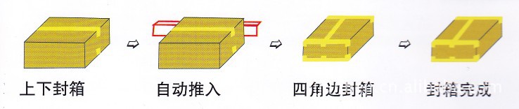 5、纸箱经前段封箱机中间上下封口后,进入90度转角机构,由推箱板推入角边封箱机封箱机构;纸箱上下四个边角同时气动封口、抚平。