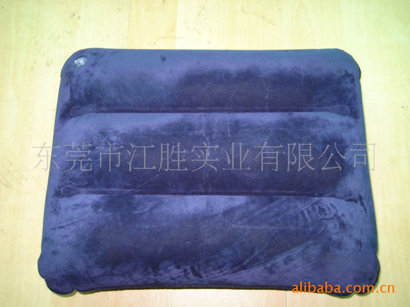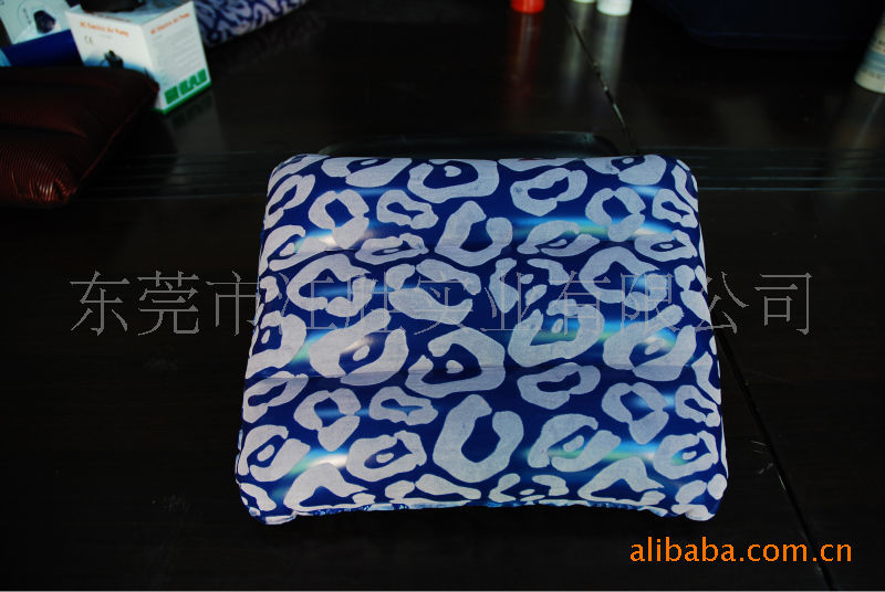 PVC植绒充气靠垫:用大小均等的椭圆片PVC料经高频热压成型,倒阀门气嘴,具有双层防漏气渗气功能。(充气或放气时捏扁气门嘴,使用方便)。