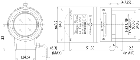 | | M13VG246 | 成像器大小 | 1/3 | 交换镜头座 | CS | 焦距 | 2.4~6mm | 光圈范围 | 1.2~360 | 视场角 (水平x垂直) | 1/3型 | Wide | 111.3゜x83.5゜ | | Tele | 47.1゜x35.4゜ | | 1/4型 | Wide | 83.5゜x62.6゜ | | Tele | 35.4゜x26.6゜ | 焦距范围 | 0.3m~∞ | | 操作方法 | 焦点 | 手动 (带锁定结构) | 变焦 | 手动 (带锁定结构) | 光圈 | DC自动光圈 | 过滤器口径 | - | | 后焦点 (in air) | Wide 7.84~Tele 13.72mm | 工作电压 | Open 4.0V Close 0.7V | 质量 | - | 工作温度范围 | -20℃~+60℃ | | 配线图 |