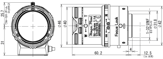 | | M13VG550 | 成像器大小 | 1/3 | 交换镜头座 | CS | 焦距 | 5~50mm | 光圈范围 | 1.4~360 | 视场角 (水平x垂直) | 1/3型 | Wide | 53.8゜x40.3゜ | | Tele | 5.5゜x4.2゜ | | 1/4型 | Wide | 40.3゜x30.2゜ | | Tele | 4.2゜x3.1゜ | 焦距范围 | 1m~∞ | | 操作方法 | 焦点 | 手动 (带锁定结构) | 变焦 | 手动 (带锁定结构) | 光圈 | DC自动光圈 | 过滤器口径 | - | | 后焦点 (in air) | Wide 10.28 ~ 10.98mm | 工作电压 | Open 4.0V Close 0.7V | 质量 | 77g | 工作温度范围 | -20℃~+60℃ | | 配线图 |
