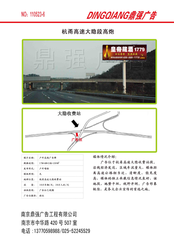南京鼎强广告工程有限公司成立于2003年,专业致力于设计、制作、发布、代理国内各类广告,户外、高炮广告为一体的综合性公司。公司在南京市区、机场高速、沪宁高速、沪杭高速、宁杭高速、宁合高速、宁六高速、G104国道、大桥、二桥等交通要道有户外媒体。合作单位涉及金融业、建材业、酒业和房地产业等。公司具备多年大型户外广告发布的经验,提供专业和完善的售后服务,业务遍及江苏、浙江、安徽、上海等地。我们擅长运用高新科技,从客户需求及传播效果出发,整合并创造新概念户外媒体,以提供从“精准策略-犀利创意设计”至“完美制作-有效执行发布”,客户满意率达95%以上。