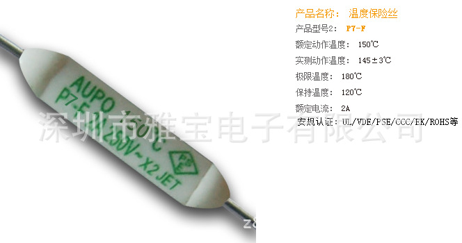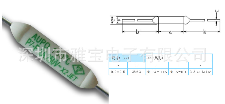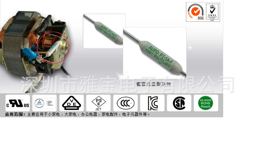 雅宝电子有限公司创建于1986年,为港商独资企业,注册资金5000万港币,总投资9000万港币,厂房面积5万平方米,是一家专业从事温度保险丝(热熔断体)的研发、生产与销售为一体的高新技术企业。主要产品有合金型(1-5安培)和有机物型(10-16安培)温度保险丝,共有10多个系列一百多种规格,年生产能力达10亿只各类温度保险丝。