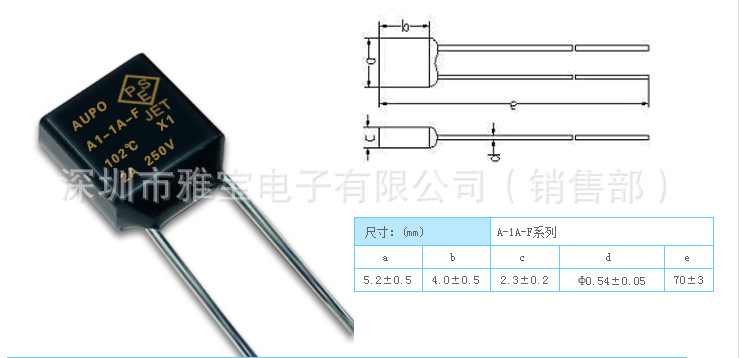 雅宝电子有限公司创建于1986年,为港商独资企业,注册资金5000万港币,总投资9000万港币,厂房面积5万平方米,是一家专业从事温度保险丝(热熔断体)的研发、生产与销售为一体的高新技术企业。主要产品有合金型(1-5安培)和有机物型(10-16安培)温度保险丝,共有10多个系列一百多种规格,年生产能力达10亿只各类温度保险丝。