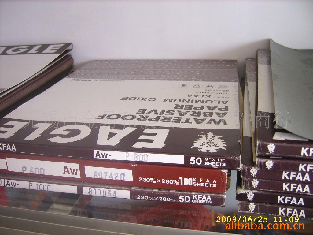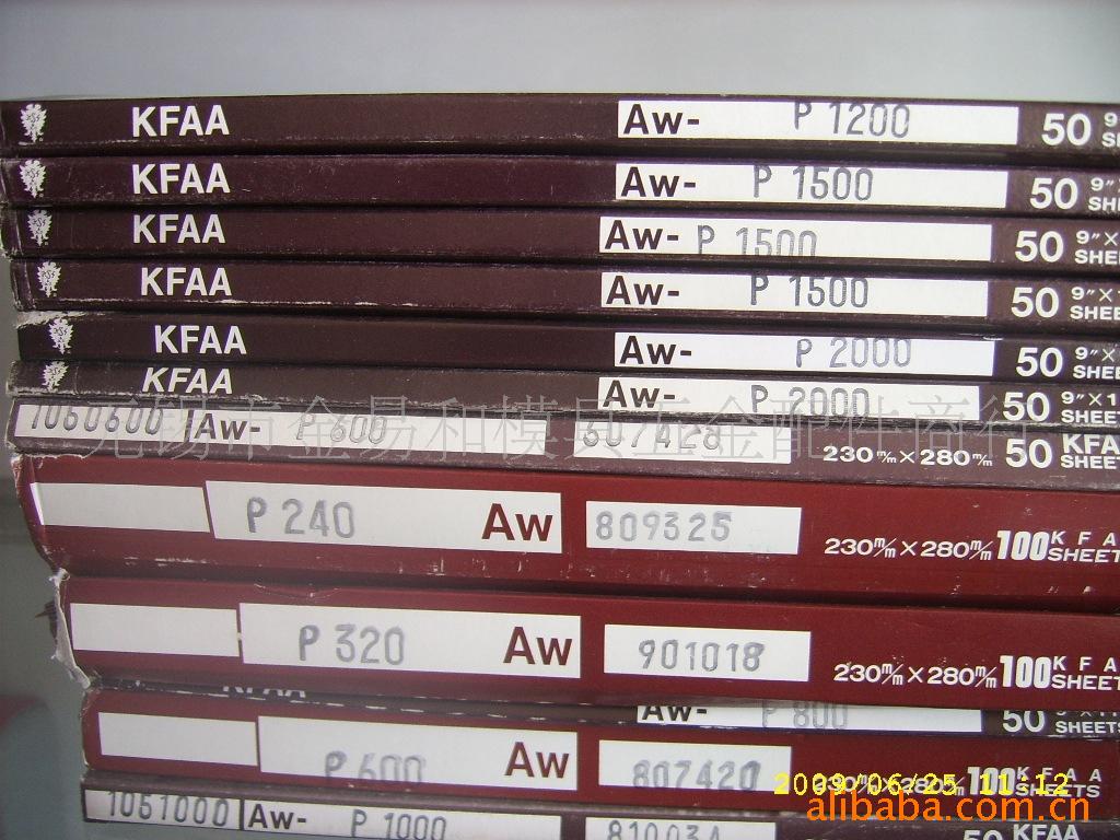 型号:KFAA种类:碳化碳规格:方形230mm*280mm材质:氧化碳铝粒度:120-2000(目)适用范围:车身磨底或磨硬面,钢铁类,背纸经过防滑处理,磨纹及纸张屈曲度极佳。原产地:日本革命性的产品无论纸质、砂纸、涂浆及耐水力远超过普通水砂纸。最佳背纸:采用日本乳胶纸,张力及抗拆力俱佳,耐水耐油,纸背经过了防滑处理,耐用性非常好。最佳磨料:全部用PA高硬度金刚砂,纯度及密度非一般刚砂可比,全部用电子、静电子、静电技术涂布,每一平方时之砂含量及均匀性达世界最高标准。最佳涂浆:底浆及面浆用日本双鹰厂独有之配方,不但磨料牢固,切削有力,耐水性强,更增加纸张的强度。最佳磨纹:深浅适当,均衡,容易抛光。P1000,P1200,P1500,P2000完全可以代替金相砂纸,但比金相砂纸耐用5倍以上。特别耐用,适合车身磨底或磨硬面,钢铁类,背纸经过防滑处理,磨纹及纸张屈度极佳。原产地:日本增加效率,改进质量,请用红鹰牌耐磨砂纸!产品用途:汽车厂,铝合金钢圈厂,汽车烤漆,模具厂,木制工艺品厂,乐器厂,家具厂,塑料制品厂,装饰材料厂,造船厂。