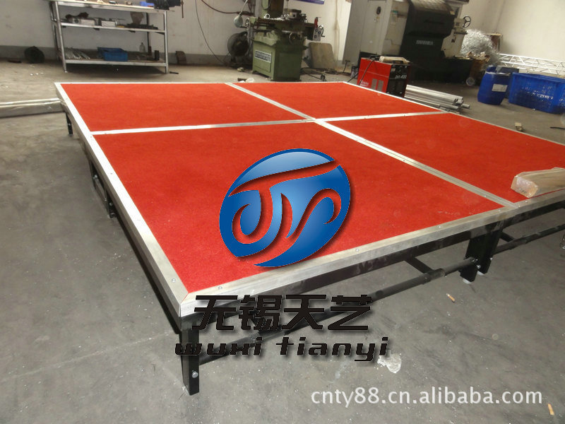 (4)舞台整体采用铝合金型材包边,外形更美观,大方。整体更加高档,豪华。3、舞台承重量:最低500公斤每平米4、表面处理(1)脱脂去油处理(使钢管表面油渍,杂质脱落)。(2)表面镀锌,喷塑,喷漆处理可供客户选择,。5、实物照片舞台架为:50*25*2MM方钢支撑钢管:50*25*2MM厚支撑架为:50*25*2厚钢管台面为:18MM胶合板加5MM加厚红色地毯,台面为3#角钢包边6、舞台高度:舞台有两套支腿系统,正常高度为30CM,可以调节到40CM,两种高度可以任意调整使用,亦可根据客户要求定做。7、舞台尺寸:折叠舞台为宾馆专用舞台尺寸寸规格为1.22*2.44。