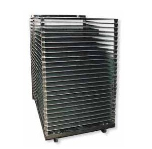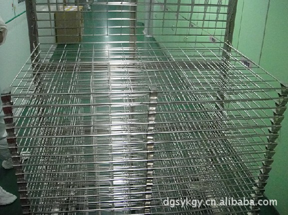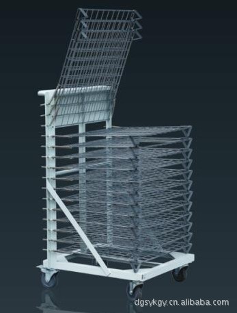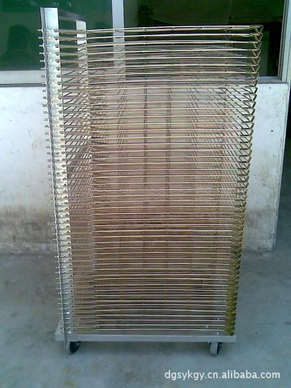 不锈钢千层架,又叫丝印千层架、乾燥架、千层车、晾晒架、晾纸架、网架、层架台车。适用于印刷、上胶、喷电镀干燥架漆、上色,溅镀後的晾乾置放器材。活动式多层网格设计,置放空间大,操作方便,节省车间、库房面积,并可适用於所放产品的常温晾乾和进焗炉高温烘烤。使用的材料有不锈钢,碳钢等。主架一般采用角钢制作,表面处理有喷漆/烤漆/电镀锌;网片采用2-12MM的线材制作,表面处理的方式有电镀彩锌,喷塑(也叫包胶,用于防止产品划伤采取的一种表面处理方式)。适用范围: 广泛适用于丝印厂、转印烫画厂、印刷电路板厂、电子加工厂、饰品厂、鞋厂、皮带皮革厂、防静电器材厂、木器涂装厂、彩绘玻璃、上糊乾燥、中大型家俱厂、百中窗廉厂,溅镀厂等。