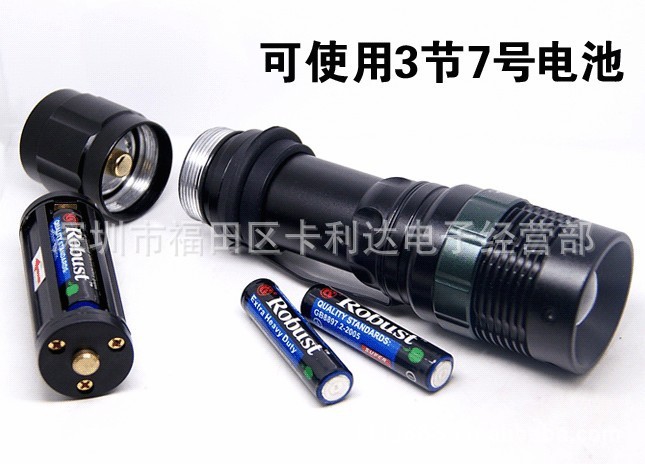 Q3变焦调光可充电强光手电筒,流明达到210,射程200以上,使用时间8小时左右,位于尾部的开关可以调档,分为强光,中光,暴闪三档,独