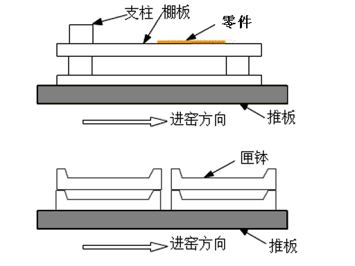 从上面图可了解推板处在推板窑内零件的最下端。因在上端装载的棚板(承烧板)及被烧成物的原因,致使荷重增加,许多推板推到往箭头方向,使得产生高压。因此推板需求及高的耐压強度和抗热冲击的抵抗能力。