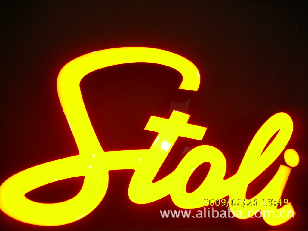 我公司生产的“LED玻璃钢浇铸通体发光字”,利用领先的独特工艺,率先把“绿色广告”和“环保广告”的概念引入发光字制作中,充分发挥了“现代高分子材料高透明”与“高亮度LED超省电”的双重优势,制造出的发光字产品亮度高、字体强度高、通体发光、字型饱满、笔画美观大方,而且防水节能,寿命长达10年以上, 是目前广告招牌字的首选,产品比吸塑字、霓虹灯字有优势。代表了今后广告发光字的方向。同时,还开发出不锈钢边和钛金边环氧浇注面LED发光字,使金属和高分子透光材料天然高强度粘接,永不分裂,风格简练,美观防水,突破了一般金属边发光字开裂漏水不足。产品畅销全国各地,并出口欧美等数十个国家和地区。