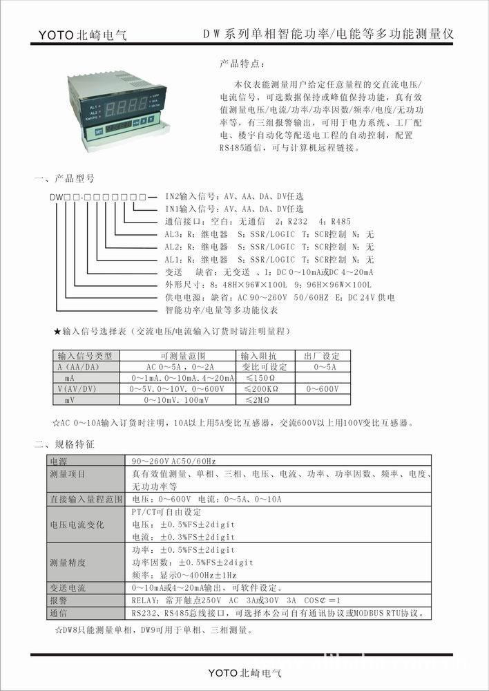 本仪表能测量用户给定任意量程的交直流电流电压/电流信号,可选数据保持或峰值保持功能,真有效值测量电压/电流/功率/功率因数/频率/电度/无功功率等,有三组报警输出,可用于电力系统、工厂配电、楼宇自动化等配送电工程的自动控制,配置RS485通信,可与计算机远程链接。
