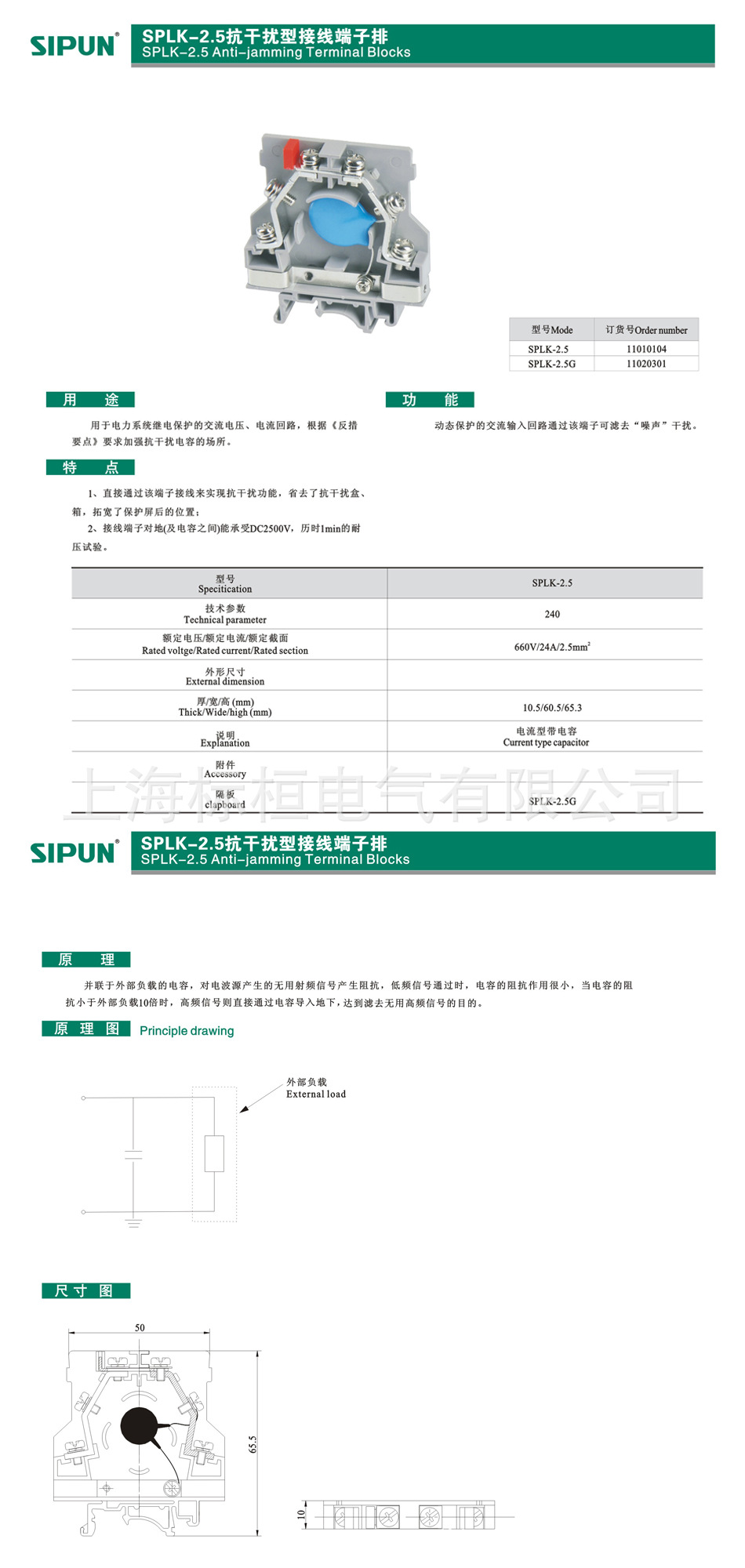 用途 用于电力系统继电保护的交流电压、电流回路,根据《反措要点》要求加强抗干扰电容的场所。功能 动态保护的交流输入回路通过该端子可滤去“噪声”干扰。特点 1.直接通过该端子接线来实现抗干扰功能,省去了抗干扰盒、箱,拓宽了保护屏后的位置; 2.接线端子对地(及电容之间)能承受DC2500V,历时1min的耐压试验。