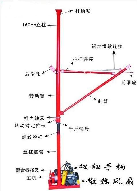 5、调整转动臂高低,使其位置适当,再调整拉臂钢丝绳长短,以适应所吊物件。