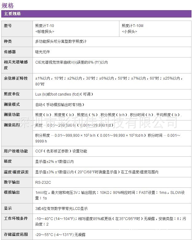 - 超大测量范围(0.01至299,900 lx)并可自动进行量程切换。量程切换也可通过手动完成。
