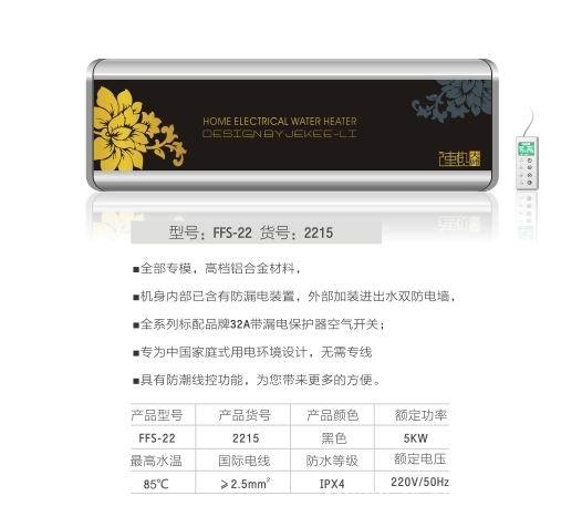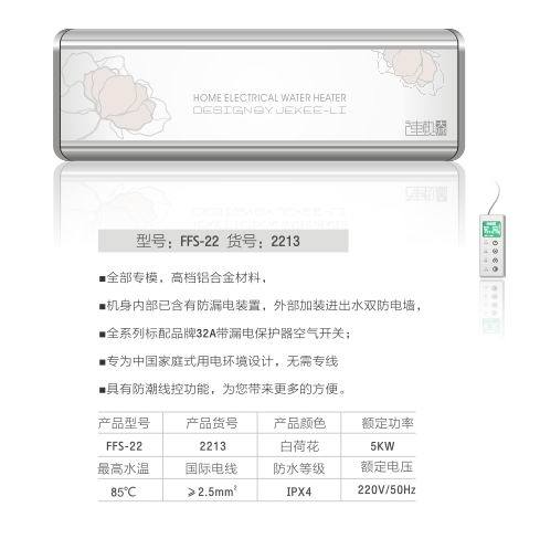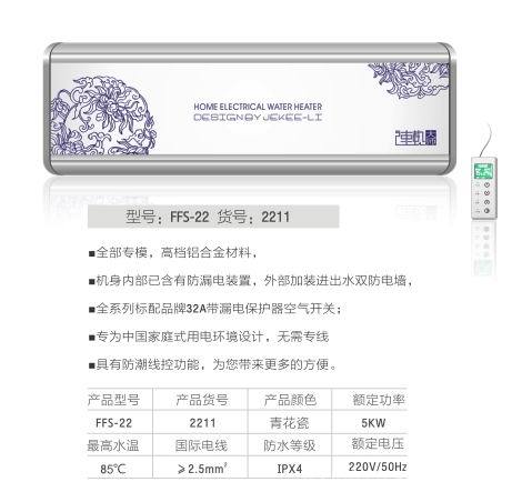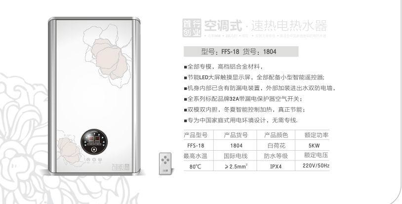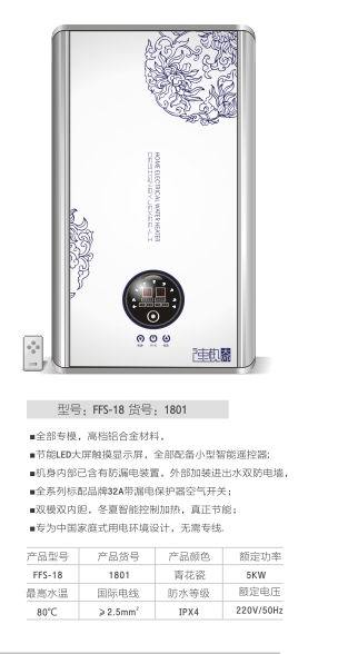 全触摸加无线遥控,新款专模,高档外观材料,节能LED白屏全触摸显示,全部配备小型智能受控器,机身内部已配备防漏电装置,外部加装进出水双防电墙,全系列加配品牌32A漏电保护器空气开关,智能加热专为中国家庭用电环境设计,无需专线
