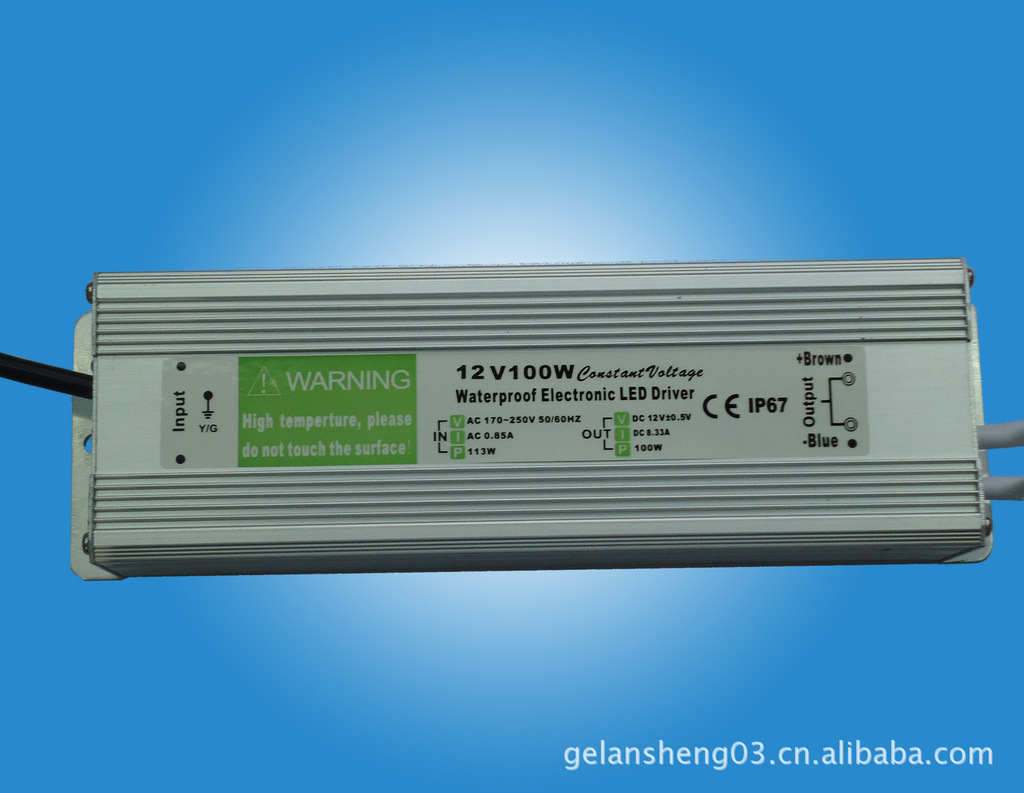 100W防水型电源技术参数表 输入电压/Input Voltage:AC90-120~200-240V 47~63Hz 输出功率/Total Output Power:100W max 效率/efficiency:≥80% 耐压/pressure-proof:AC1.5KV 防水等级:IP67 工作温度/Operating Temperature:0~40℃@100%Pout -10℃@80%Pout 50℃@60%Pout 储存温度/Storage Temperature:-20℃~85℃ 保护功能/defencive function:短路,过载 重量/weight:0.16 KG