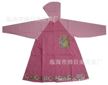 专产高档EVA儿童雨衣,迪斯尼可爱雨衣,工厂从PE、PEVA、EVA面料到成品一条龙生产,可定做客户的厚度、颜色及规格尺寸,日产3-5万件,本产品环保不含重金属(铅、铬)等有害物质,无毒、无味、耐腐蚀、耐撕裂、冬天不发硬,具有艳丽的色彩和丝绸般的柔软性,可定做成可降解面料,可回收,可印刷广告,符合美国ASTM-T963,欧洲EN-71的标准,通过SGS、欧盟RoHS环保检测认证,我厂是国际各大赛事及超市的供应商。工厂成立于1997年,新厂房16000平方,按国际验厂标准设计。