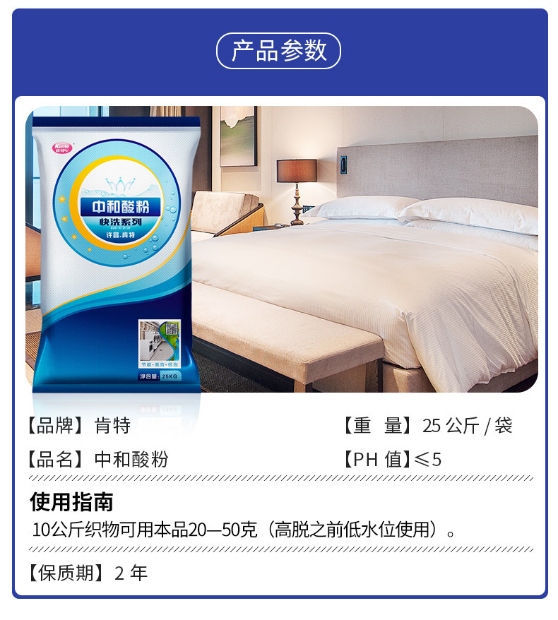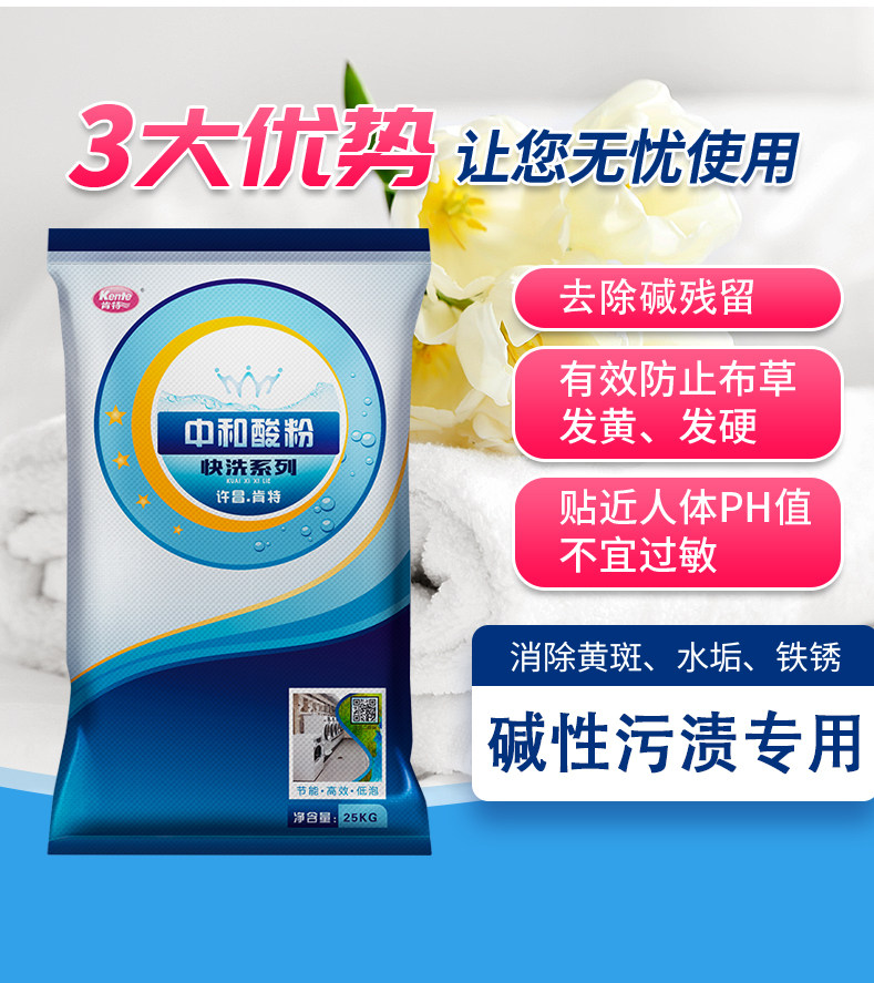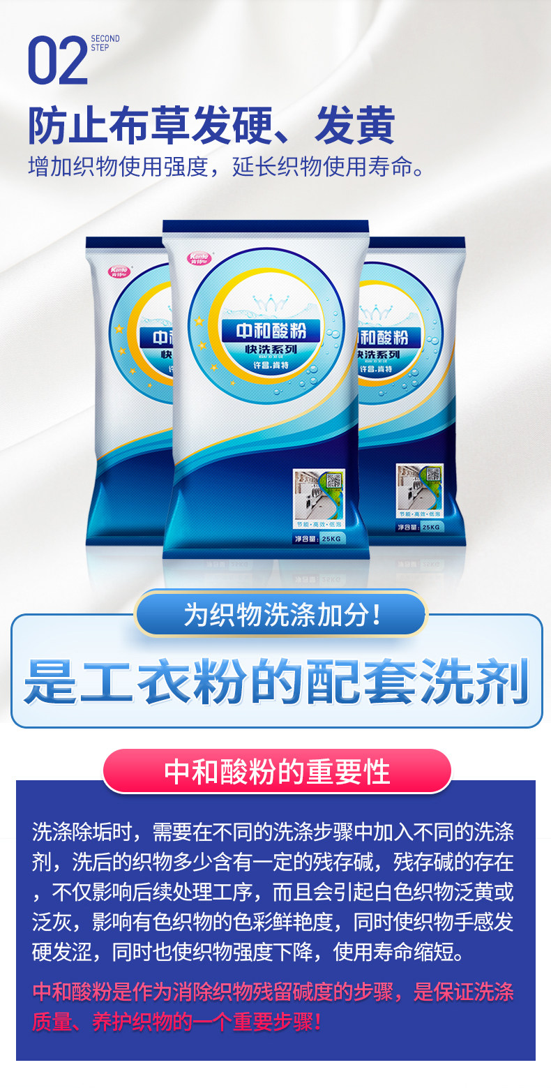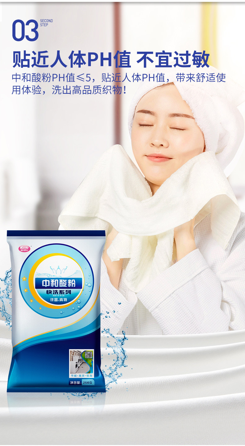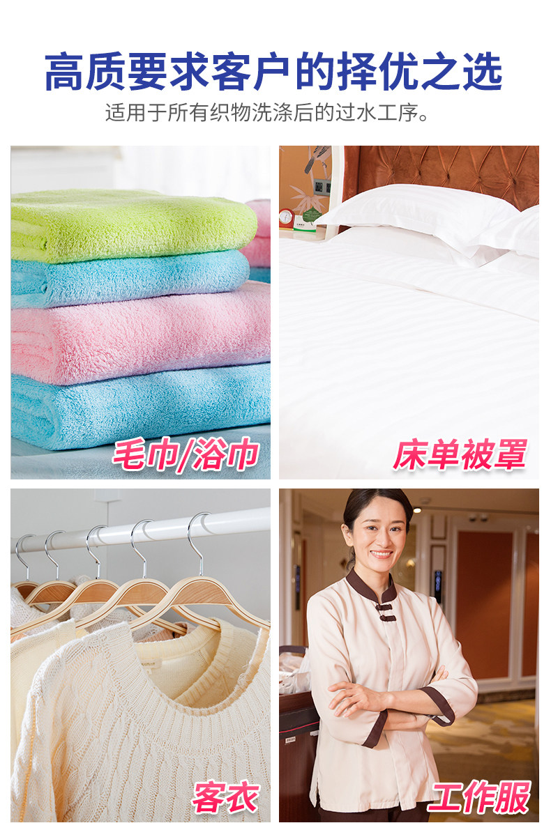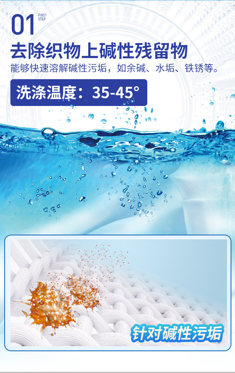本品可有效消除余碱、水垢、铁锈等有害残留物,减少过水次数,防止织物手感发硬、泛黄,延长织物使用寿命。建议洗涤温度:35-45度。