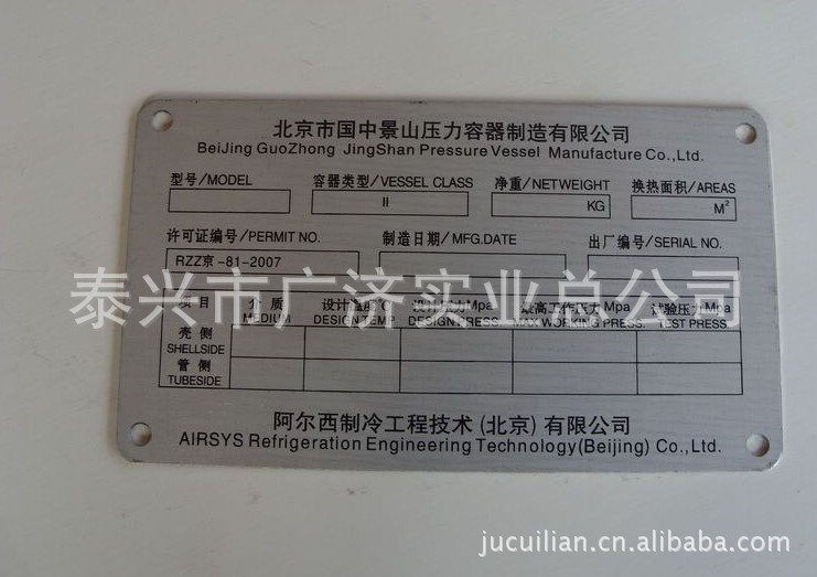 我司成立于1990年,具有丰富的经验,我司位于江苏省泰兴市,是一家专业生产标牌、商标,集设计、开发、生产、销售于一体的厂家,我们谨记服务宗旨:尽我们最大的努力为您提供最快、最优、最满意的服务! 至今我们的主要客户群体是:安徽星马汽车和河南驻马店华骏汽车等;主营产品是标牌,铭牌、铝标牌、金属标牌、腐蚀标牌、PVC标牌和不锈钢标牌。 本厂努力满足客户的需求,在最短的时间内完成出样出货,保证以最优的品质,最合理的价格为您提供服务!欢迎来电来函洽谈业务!