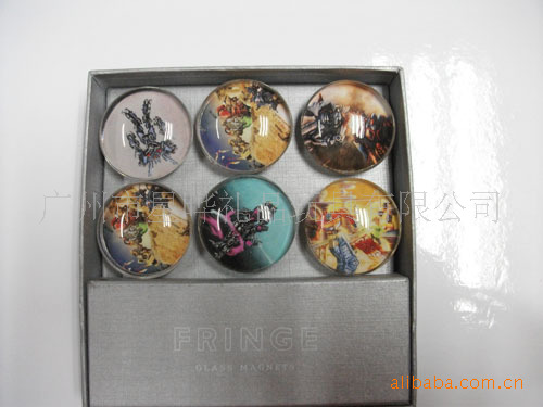 11)玻璃冰箱贴:采用下面软胶磁铁+上面铜版纸彩色印刷+半圆玻璃窗腹膜制作而成