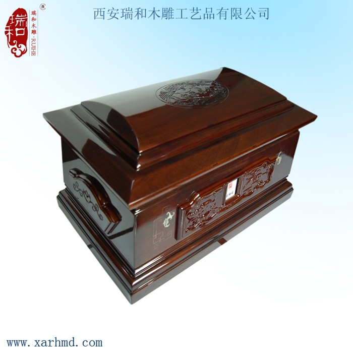 【说 明】:西安瑞和木雕工艺品厂生产的骨灰盒选用优质南洋红檀为原料,该木木质硬重,耐腐,木质细腻光滑,属名贵木材。本产品造型新颖大方,线条流畅,艺术美观,工艺精湛,加上采用高档PU金铜漆喷漆工艺,漆面光亮,更显富有名贵,大气庄重,属高档寿盒。
