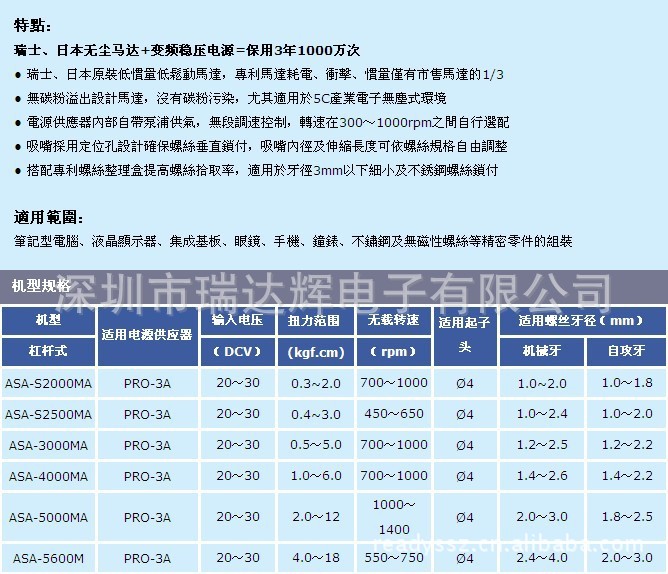 深圳市瑞达辉电子有限公司成立于2002年,公司自成立以来致力于螺丝供给机、胶带切割机、自动标签感应机、自动锁螺丝机、各种批咀系列、SMT点料机系列、无铅焊接系列、自动焊锡机的研发、生产及销售。经过数年的发展,产品随着公司的发展也在不断丰富和更新,在行业都具有一定的影响力,在螺丝供给机方面,成功申请了国家专利,轨道可调,不卡螺丝,在技术方面成为行业的排头兵!成为第一个拥有自主品牌的生产厂家!