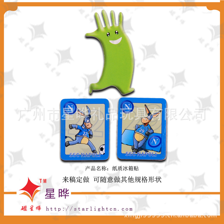1)磁性冰箱贴:采用下面软胶磁铁+上面铜版纸彩色印刷腹膜制作而成。