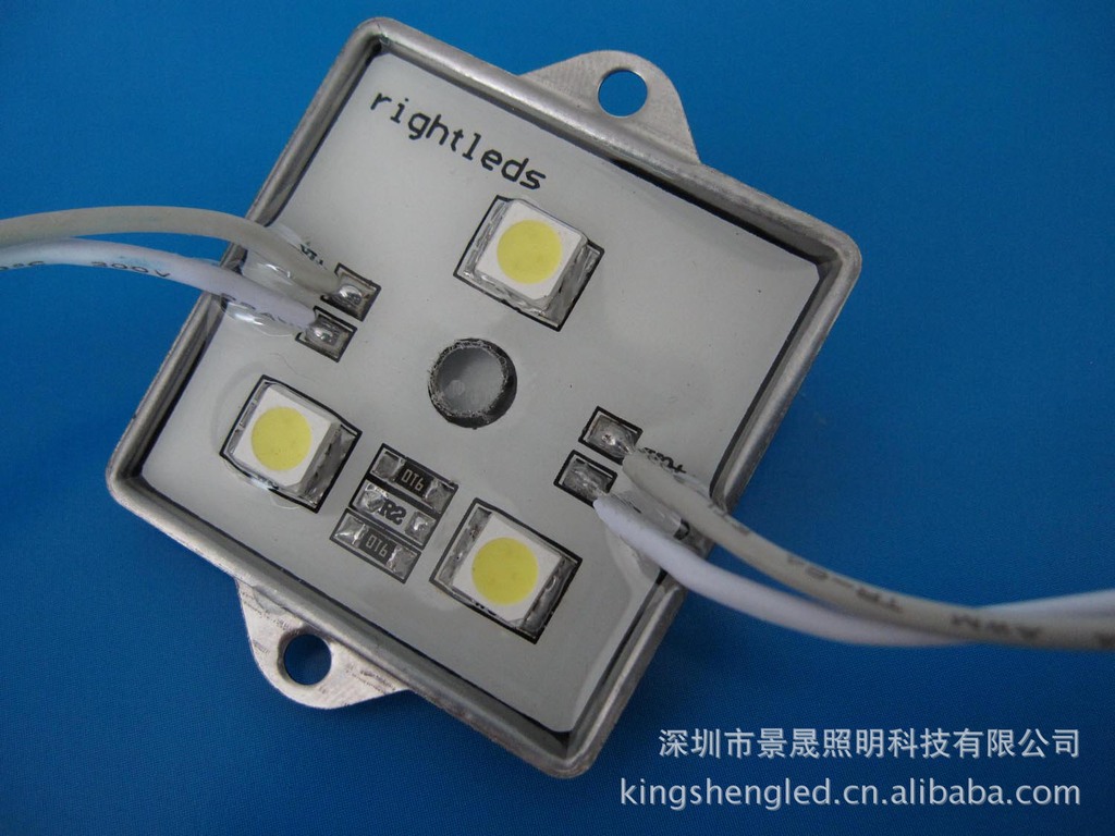 5050三灯铝壳防水模组:产品引出两根电源线,一根是白注黄色线,一根是纯白线,导线线径是22AWG,长度是110MM。白注黄线接DC12V电源正极,纯白线接DC12V电源负极。 2、安装方式: