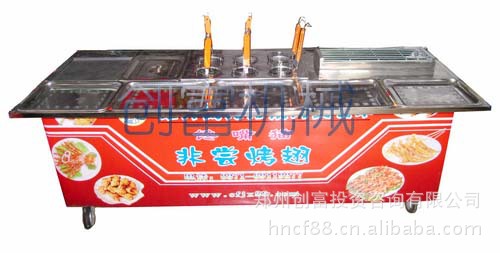 涮烫王,功能够多,五个功能,两个人就可经营种类齐全的特色小吃,米线,麻辣烫,烧烤,铁板,油炸您随意组合。外型美观,烧烤部分不需要风机设置,经营方便。底部四个轮子,加大设计,更适合流动经营!