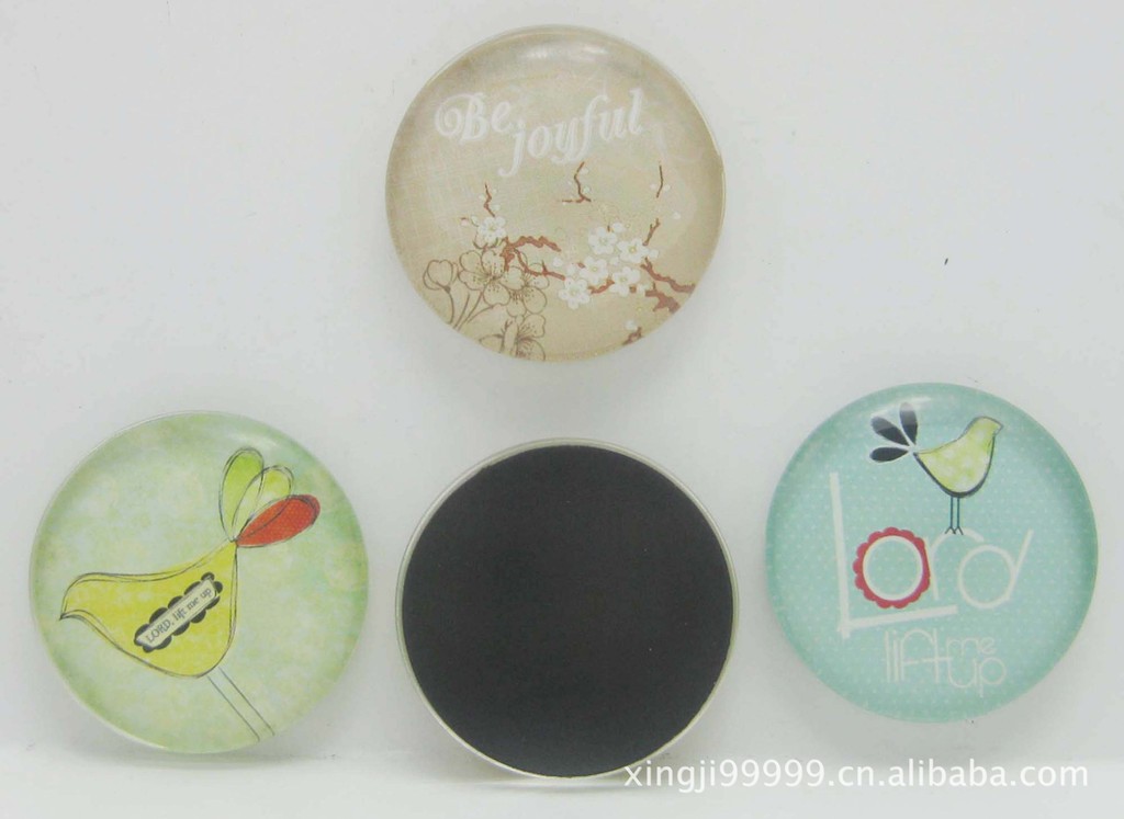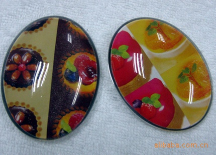 11)玻璃冰箱贴:采用下面软胶磁铁+上面铜版纸彩色印刷+半圆玻璃窗腹膜制作而成