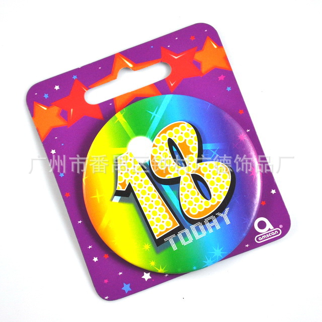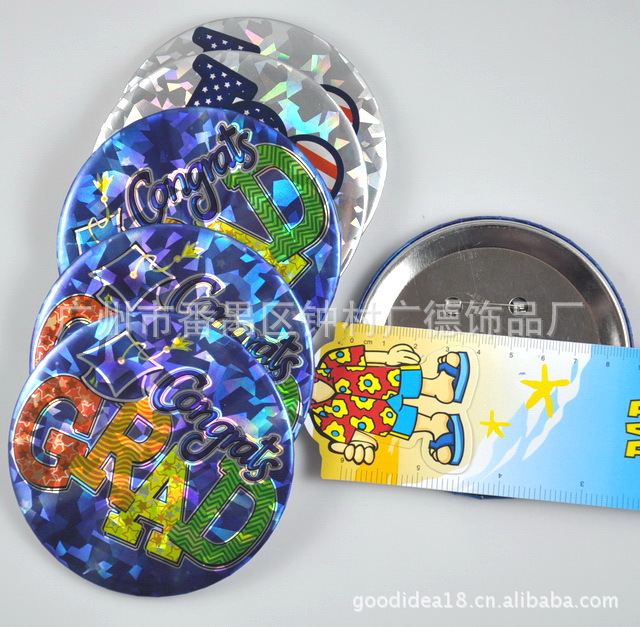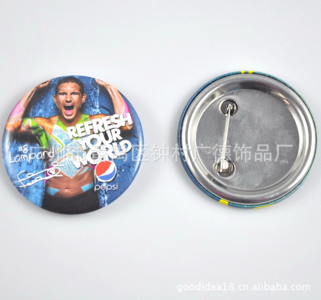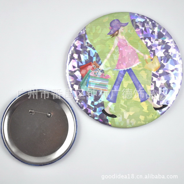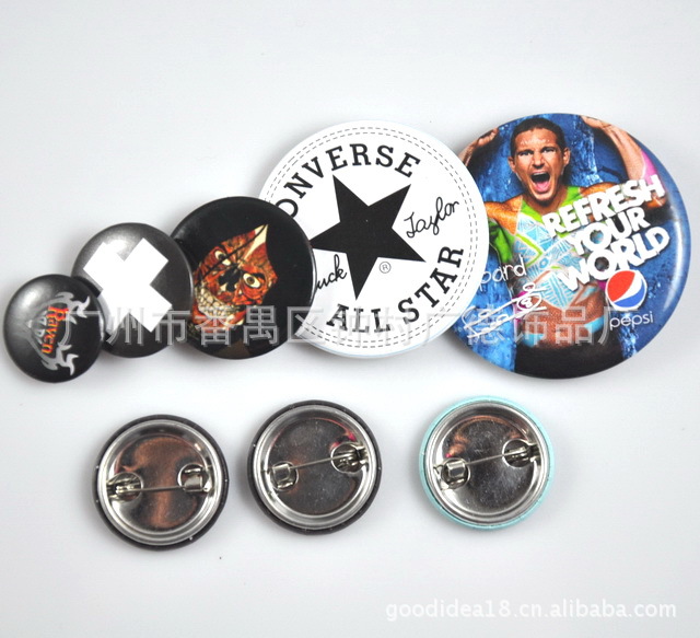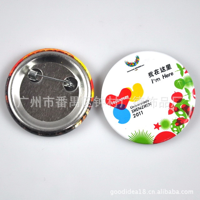 材质:157克铜板纸印刷过光胶+一级马口铁+安全别针