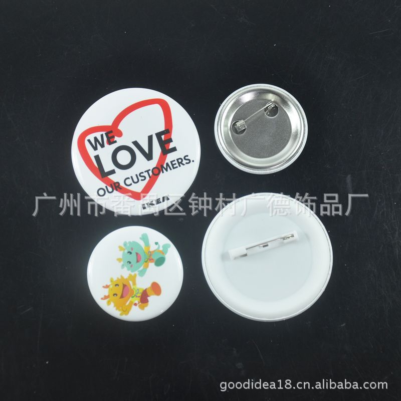材质:157克铜板纸印刷过光胶+一级马口铁+安全别针