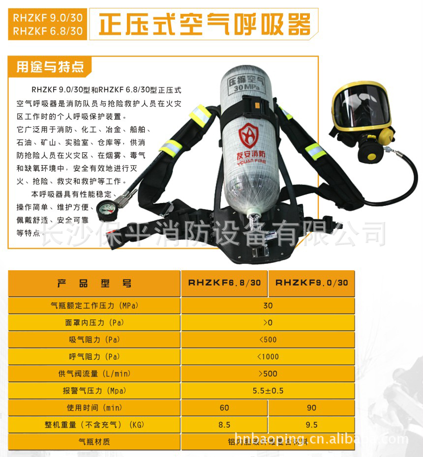 正压式空气呼吸器RHZK系列正压式呼吸器是一种自给开放式空气呼吸器,广泛应用于消防、化工、船舶、石油、冶炼、仓库、试验室、厂矿等部门,为消防队员、抢救灾害人员、厂矿作业人员在浓烟、蒸汽、缺氧等各种恶劣环境中提供呼吸保护,不吸入有毒有害气体,从而有效地进行灭火、抢险救灾救护和劳动作业。该产品经国家消防装备质量监督检验中心检测合格,符合GA124《正压式消防空气呼吸器》的要求。
