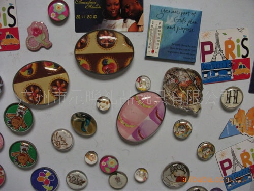 11)玻璃冰箱贴:采用下面软胶磁铁+上面铜版纸彩色印刷+半圆玻璃窗腹膜制作而成