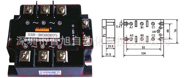 三相SSR的电流电压等级的选取及保护等有关使用注意事项请参考单相交流固态继电器。如要求电流更大,可用三只长条状单相固态继电器代替(三只长条状SSR可安装在一只带风扇的A系列散热器上),三个输入端可串、并联)。