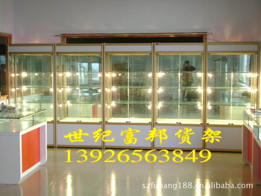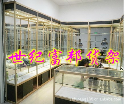 【展柜基本结构介绍】边框颜色有三种流行色:金色、银色、黑色,上面为20公分灯箱,下面储物柜可做40-50公分对开门或者推拉门,材料为0.5-0.8厘高密度板,顶部灯箱中可装2个射灯,中间为四面玻璃(后背也可以安装镜片),3层玻璃隔板,4个空档,隔板为8mm厚玻璃,侧面、背面、门为玻璃,(门分推拉门和对开门),其他规格和尺寸支持定做!