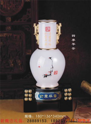 四季平安》以大肚的瓶子为造型,以琉璃玉为材质,做工细腻,精美别致。瓶子四平八稳、安之如山,暗喻平(瓶)安、基业永固之意,且瓶身带欣欣向荣之势,意为事业蒸蒸日上、四季常青;瓶肚宽大圆润,寓大气、大富大贵之意;瓶耳为一对拐之龙的造型,龙头向上,象征万事兴隆、飞黄腾达。整体显得坚实而稳固、典雅而大气。产品以瓶子为载体,寄以平安吉祥、基业永固、大富大贵之意。广告位置:瓶身,底座。适用范围:个人收藏、居家摆设、友情馈赠、商务馈赠企事业文化宣导等。