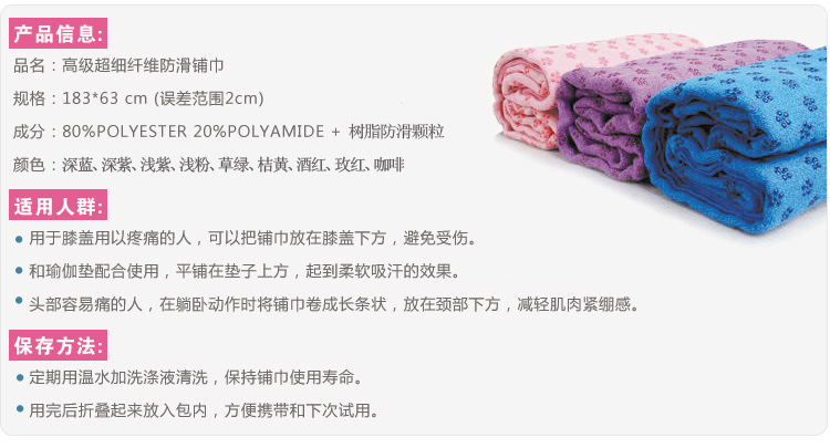 1.铺在瑜珈垫上吸收汗水。(要知道在做瑜珈运动时,身体多会排出大量汗水,滴在瑜珈垫上,