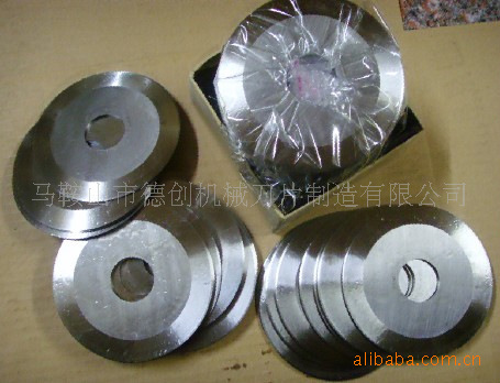 主要用于纸张,薄膜,金,银箔,铜箔,铝箔,无纺布,布,胶带,磁带等物品的分切,要求刀片切断阻力最小,耐磨性最大.出于对商品精度的要求刃具有时须达到微米级精度,选料:9CrSi,CMov,W6Mo5CrV2,W18Cr4V等1:切布刀片