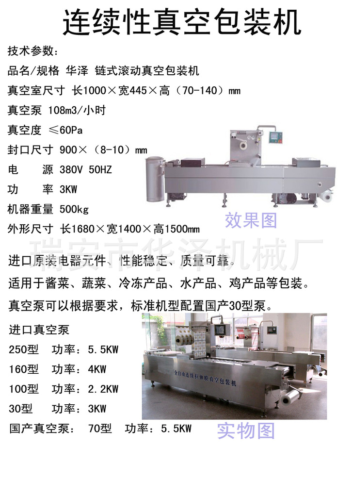 一.使用范围 本机为全自动真空包装机也称做全自动拉伸膜真空包装机/全自动塑料盒热成型真空包装机,适合于对各种食品、肉制品、海产品、果蔬、酱菜、冷却肉、医药产品、五金元件、医疗器械等进行抽真空、充气、贴体包装机。 二.主要功能 (1)光电跟踪,可选用彩盖膜或光膜进行包装、降低成本,提高产品档次; (2)采用组合模具,更换方便,一机多用,模具备有冷却系统; (3)可以根据用户产品包装要求,在抽真空的基础上,充入氮气或其他保护气体; (4)可以根据用户包装要求,配备自动打码系统; (5)真空泵有国产和进口两种选择,真空度高,质量稳定,耐用可靠; (6)采用特殊夹口式链条,适用于各种厚度的软膜、硬膜及半硬膜的拉伸成型,进行特殊包装; (7)采用先进的横切、纵切系统,更换操作方便; (8)备有边角废料回收系统,保持环境卫生。 (9)客户可以选择方盒、圆盒或其它异形盒。盒子的尺寸可根据客户产品定做膜具。 三. 生产效率 以DZL-420(下膜宽度420mm)为例,要制作90*180mm的方型塑料盒,那么一排可以成型4个盒子,6排/分钟,那么生产效率为24盒/分钟。整机属于定单式生产,所以型号也可以根据客户需要定,您只需要告诉我们要包装的产品的尺寸和生产量要求,比如说:需要包装的产品大小为:40*100mm,方盒,要求生产量在50盒/分钟,那么算下来需要9盒/排,那么下膜的宽度为9*(40+20)=540mm,那么我们的型号就定为DZL-540,以次类推。