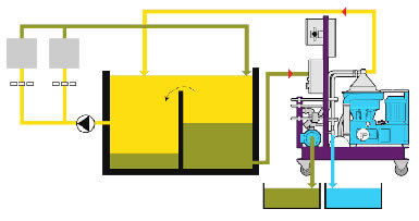 系统工作原理 油的净化在固体式分离桶中进行,供油泵把油与污染物一起输送至分离桶内,分离机产生的离心力使之分为不同的相。最重的相(残渣和水)被移到分离桶的外周。轻相即经过处理的干净油则从中央连续排放。 流入离心式分离机的润滑油从进口1流经分流筒后进入碟片组的间隙中,当转鼓高速旋转时产生比分离介质大数千倍的离心力,将油中的固态杂质和水分甩到转鼓的周边,固态杂质(油渣3)沉淀在转鼓上,由人工定期进行清理,水分从排水口5排出,净化后的润滑油向转鼓中心移动,通过碟片组的间隙从净油出口2流出,回到润滑油箱,达到净化的目的。积累的残渣定期人工取出。 |