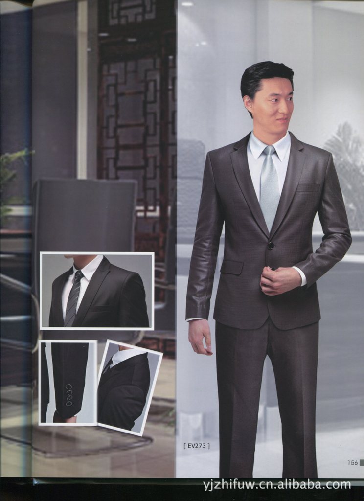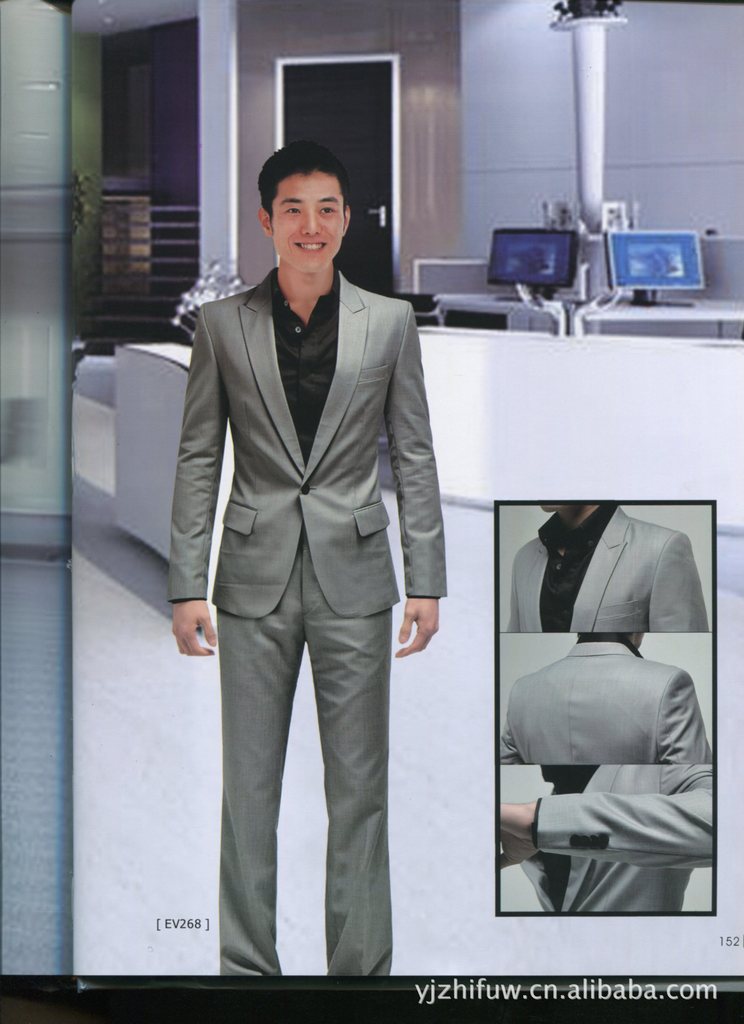 款式描述:该款为男士韩版两粒扣修身西装,西裤为无褶修身西裤。该款适合较为年轻的身材较好男士穿着,在公司定制的时候需要考虑到穿着者的体型来选择。布料描述:该款采用的是经典仿毛面料,该布料不起球不掉色,手感软熟。衬衫采用60%棉80支双股的面料,面料不起球不掉色,不容易皱。以上布料为常用布料,如需其他规格布料可询问我们的客服人员质量保证:保证一年以上正常穿着下不会出现爆线、掉色、起球和服装变形等问题。Z两粒扣男西装定做,韩版修身西装订制,男西装制服加工www.yjzhifuw.cn.alibaba.com