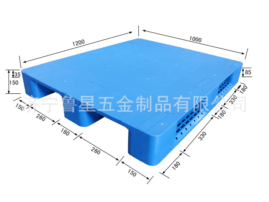 塑料托盘以低压高密度聚乙烯和聚丙烯为主要原料制成.是与国际物流接轨一次注塑成型的塑料托盘(塑胶栈板).正逐渐替代我国叉车使用的木托盘或钢托盘.是储运业的新产品.搬运仓储的好助手.与钢托盘.木托盘相比具有质轻.平整.美观.使用寿命长.整体性好.无钉无刺.无味无毒.耐酸.耐碱.耐腐蚀.易冲洗消毒.不腐烂.不助燃.无静电火花.防滑溜(装有防滑垫).可回收等优点.使用寿命是木托盘的10倍左右.是现代化运输.包装.仓储的重要工具.是国际上规定的用于食品.水产品.医药.电子电器.纺织.造纸业.烟草.化学品.立体仓储等各行业之储存必备器材.