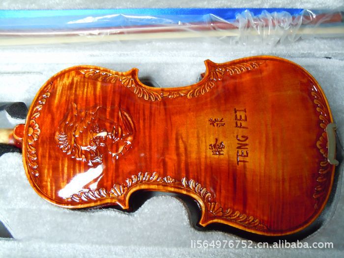 1、优质鱼鳞松面板 2、较规则虎皮纹木背板及侧板 3、独板雕刻贝多芬、琴头雕刻狮子头、四边雕花 边、雕刻名字 4、木条镶边,手工刷漆 5、高档乌木配件。 6、送高档小提琴方盒 |