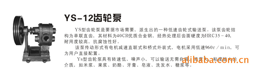 YS型齿轮泵是据市场需要,派生出的一种低速齿轮式输送泵,该泵齿轮结构为单联直齿,其材料为40CR优质合金钢,经热处理后齿面硬度为HRC35-40,耐用度较高,搞腐蚀性好。